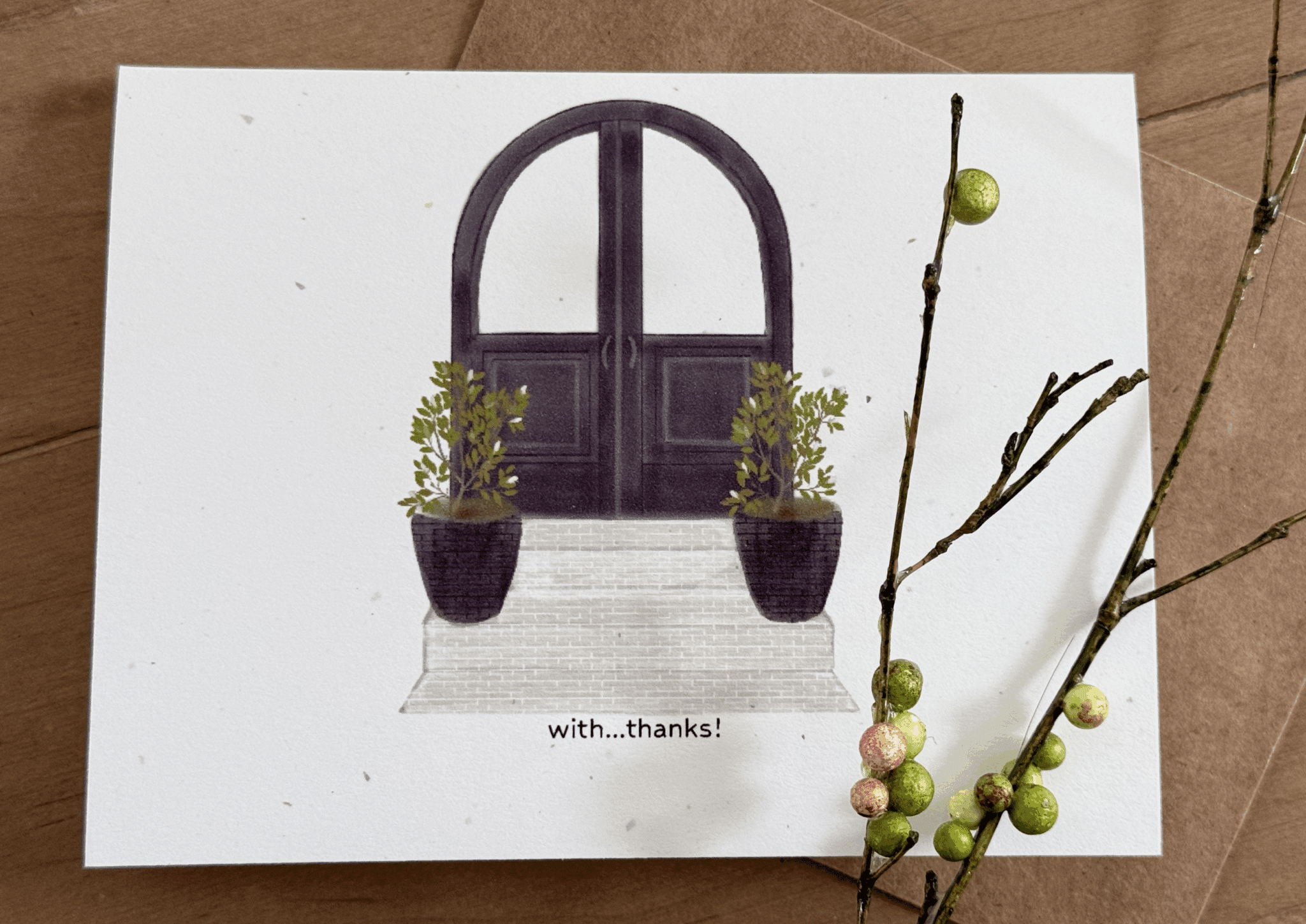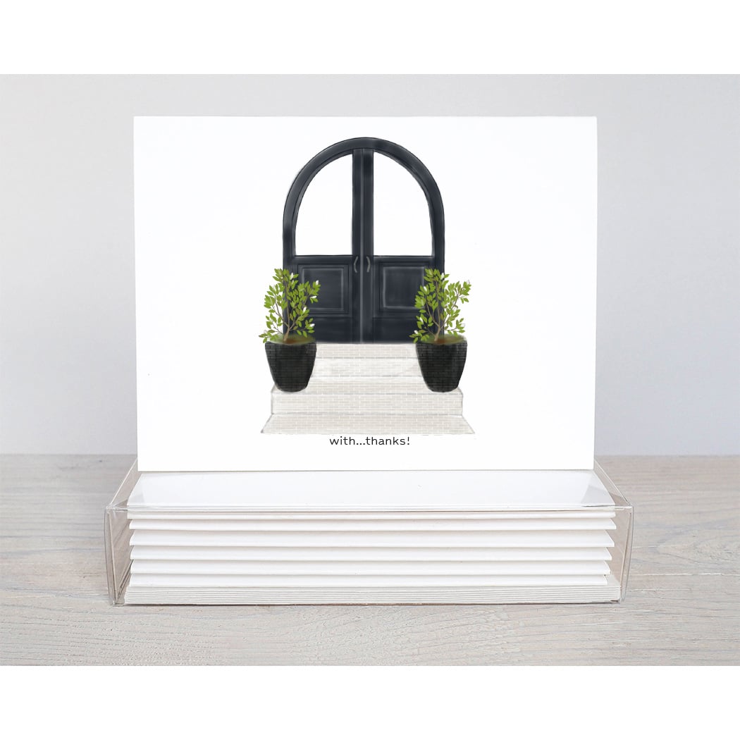 The Black Door Thank You Note Cards are simple yet elegant way to say Thank You! The arched black door with two potted trees on brick steps make a great backdrop for the simple words….with, thanks!