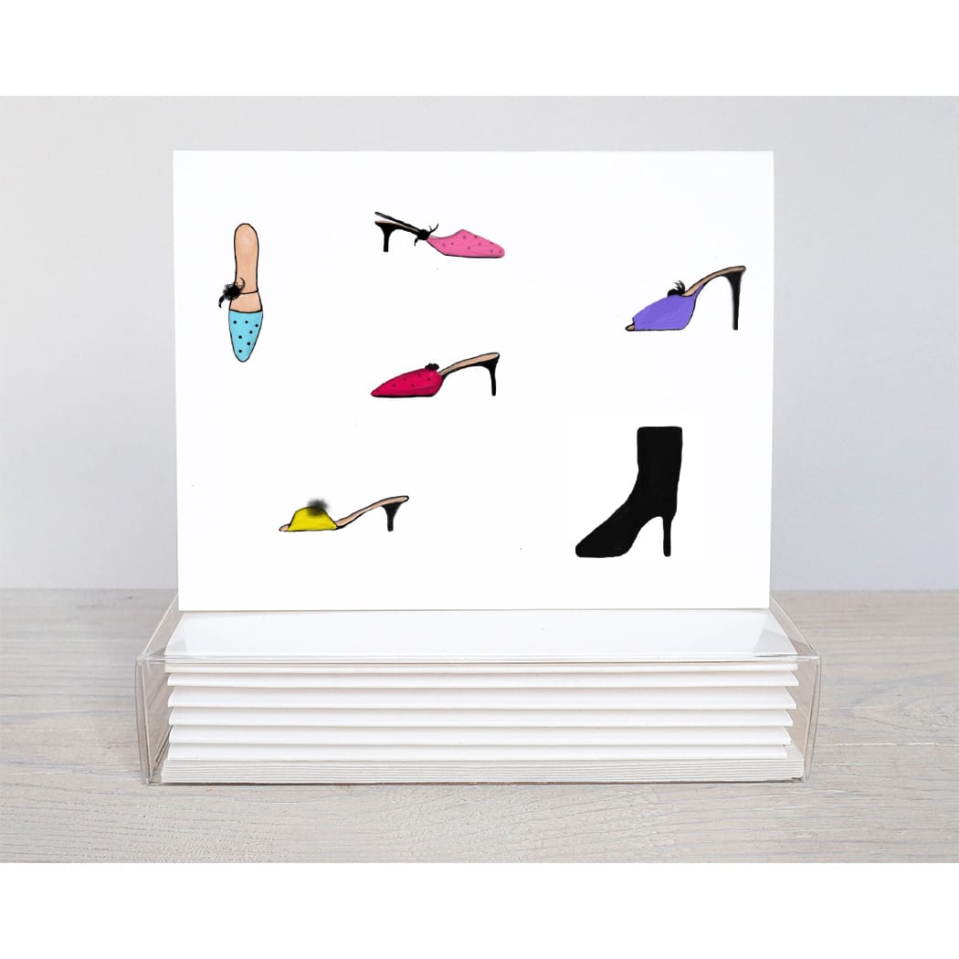 Shoes, Shoes, and More… Shoes Note Card Set that is designed with different stylish shoes. The perfect note card for a gift or just to stay in touch with your ‘stylish’ friends. This card is a perfect way to wish your shoe loving friends a happy birthday or just a note of thanks. With the adorable styled shoes…a black ankle boot, a purple high-heel, and a yellow, light blue, hot pink, and red slides there will be the shoe style that would fit all your friends.
